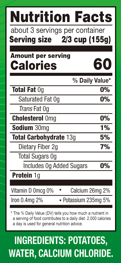 - Ingredients: POTATO, WATER, CALCIUM CHLORIDE.