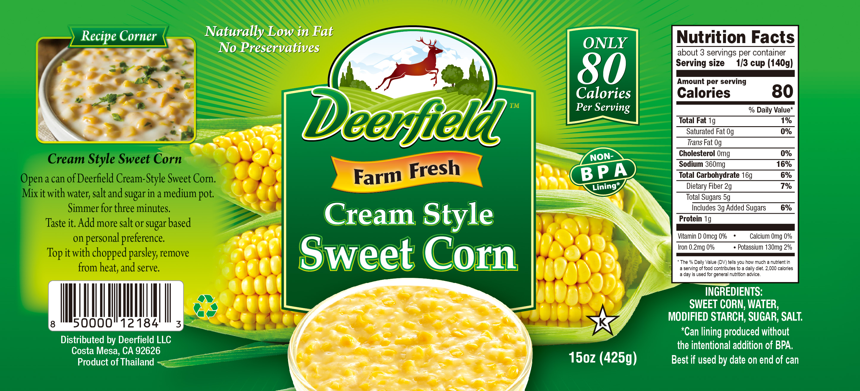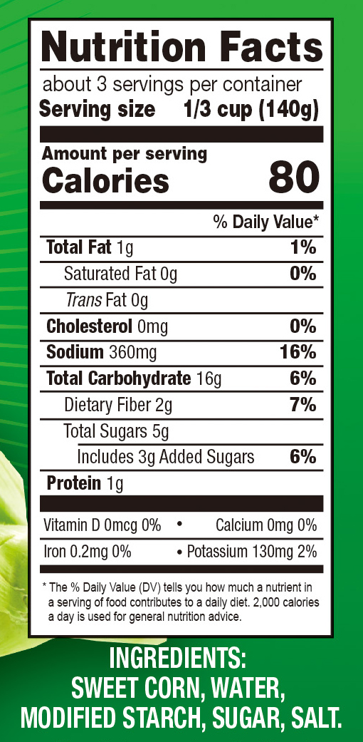 - Ingredients: SWEET CORN, WATER, MODIFIED STARCH, SUGAR, SALT.