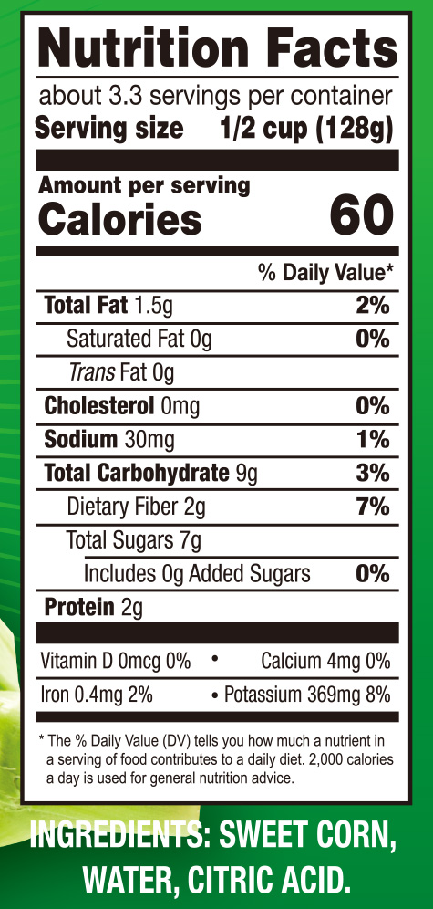 - Ingredients: SWEET CORN, WATER, CITRIC ACID.