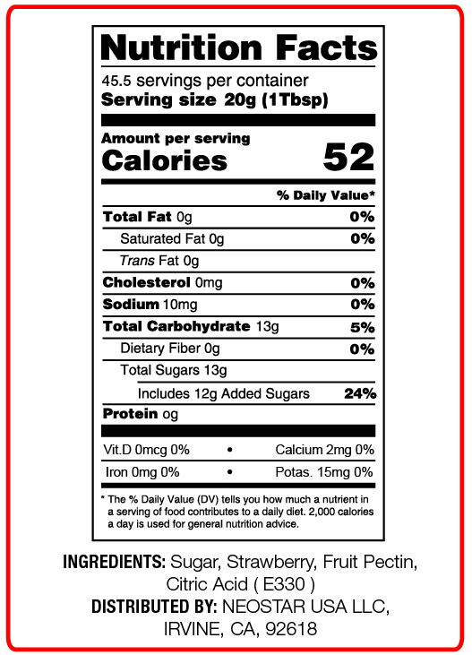 - Ingredients: STRAWBERRY, SUGAR, FRUIT PECTIN, CITRIC ACID.