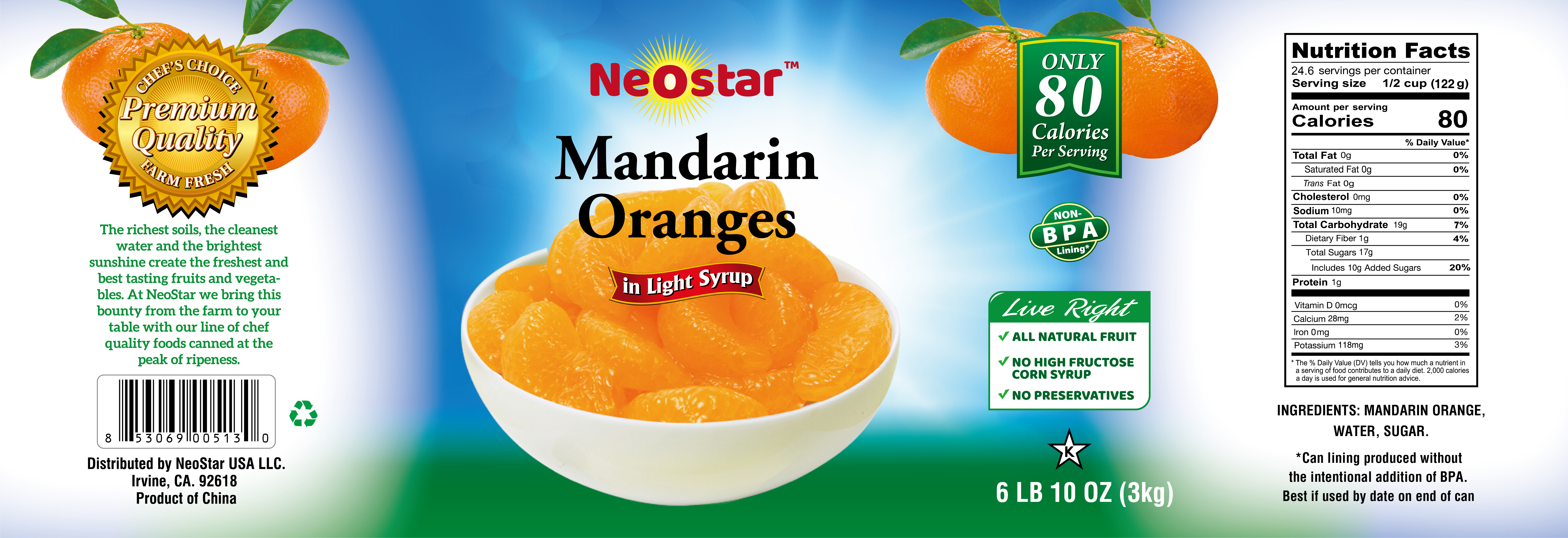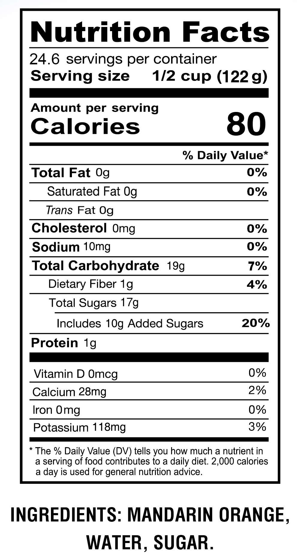 - Ingredients: MANDARIN ORANGE, WATER, SUGAR, CITRIC ACID.