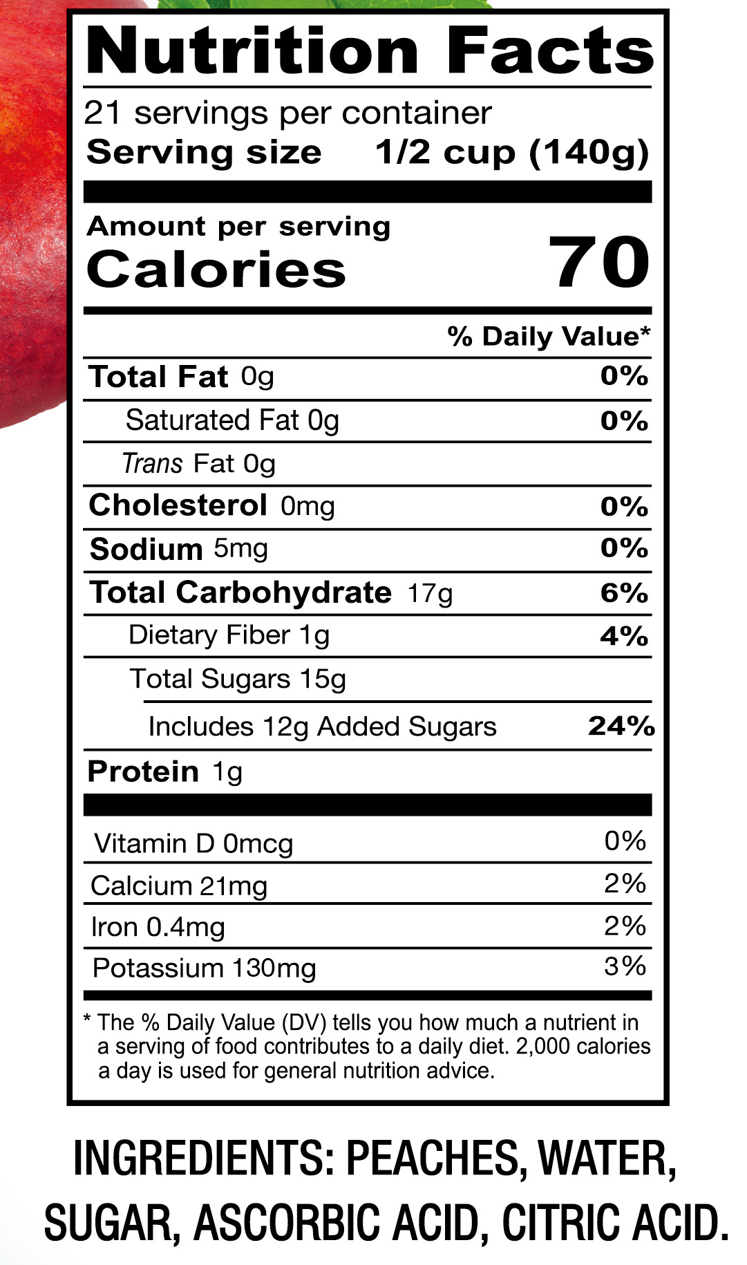 - Ingredients: PEACHES, SUGAR, WATER, ASCORBIC ACID, CITRIC ACID.