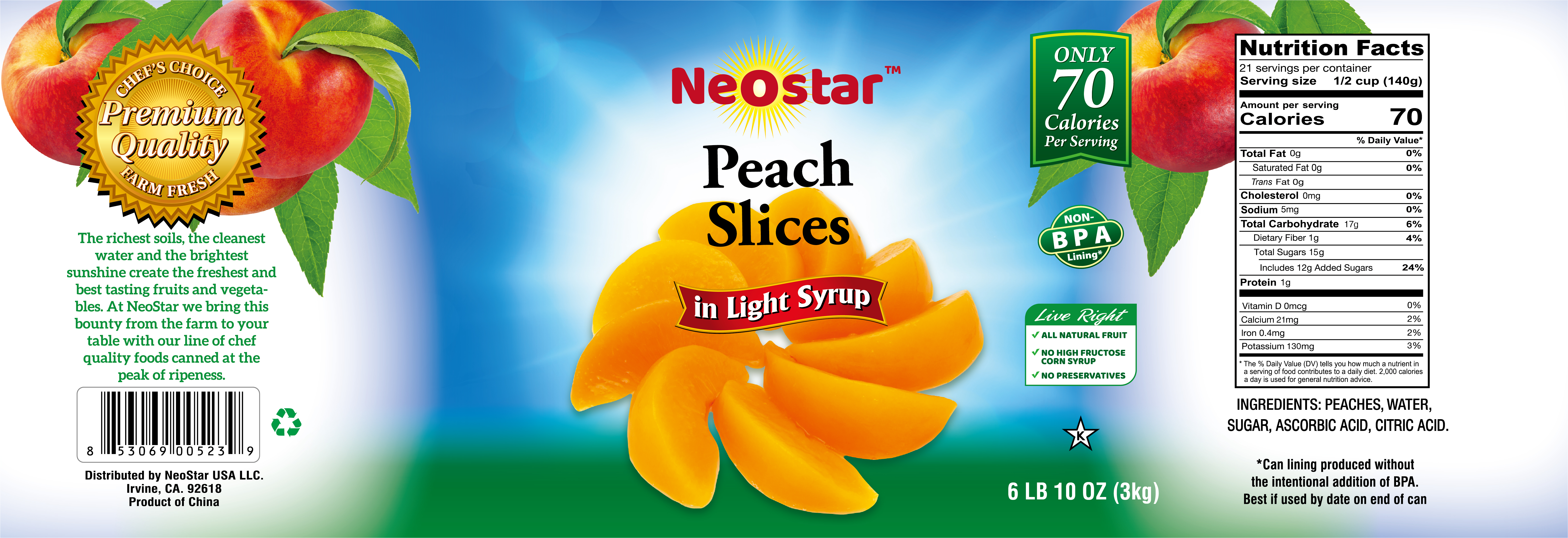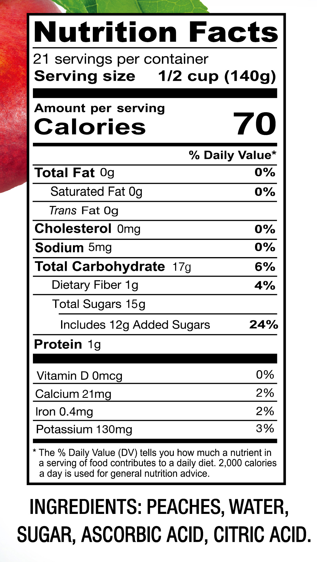 - Ingredients: PEACHES, WATER, SUGAR, ASCORBIC ACID, CITRIC ACID.