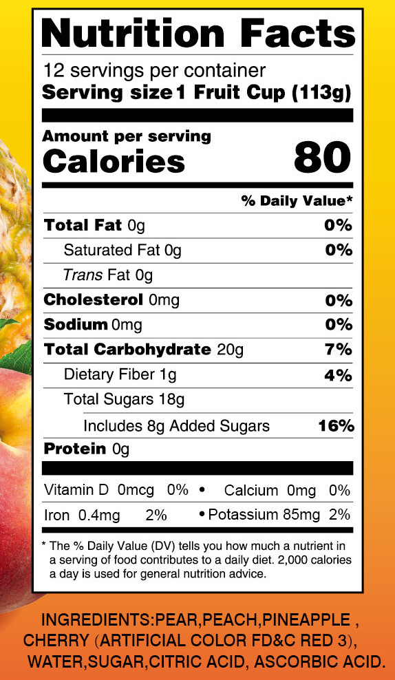 - Ingredients: PEACH, PEAR, CHERRY, WATER, SUGAR, ASCORBIC ACID, CITRIC ACID.
