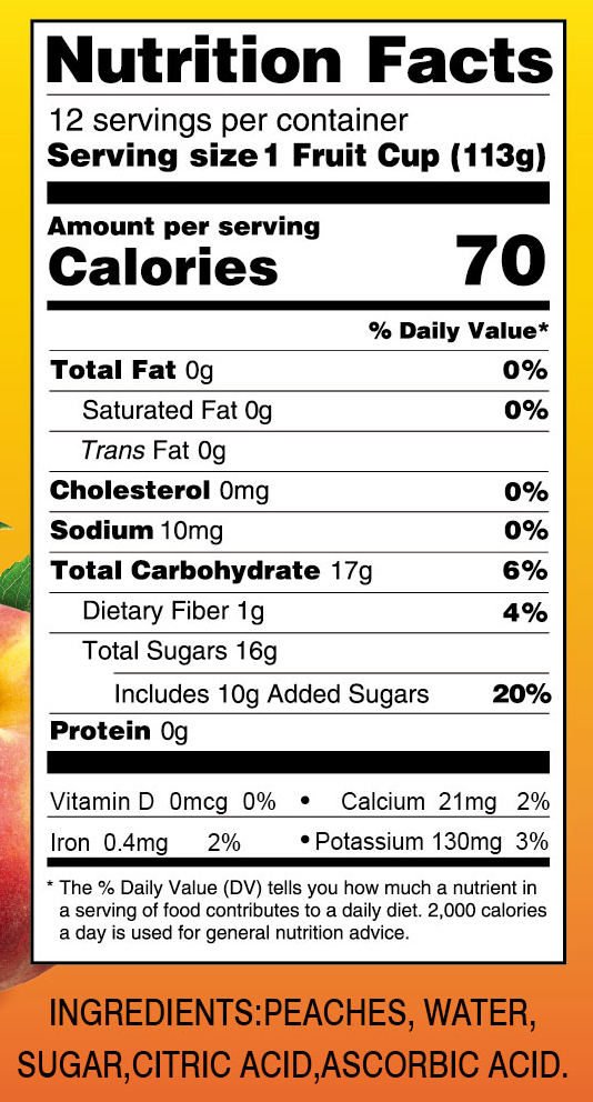 - Ingredients: PEACHES, WATER, SUGAR, CITRIC ACID.