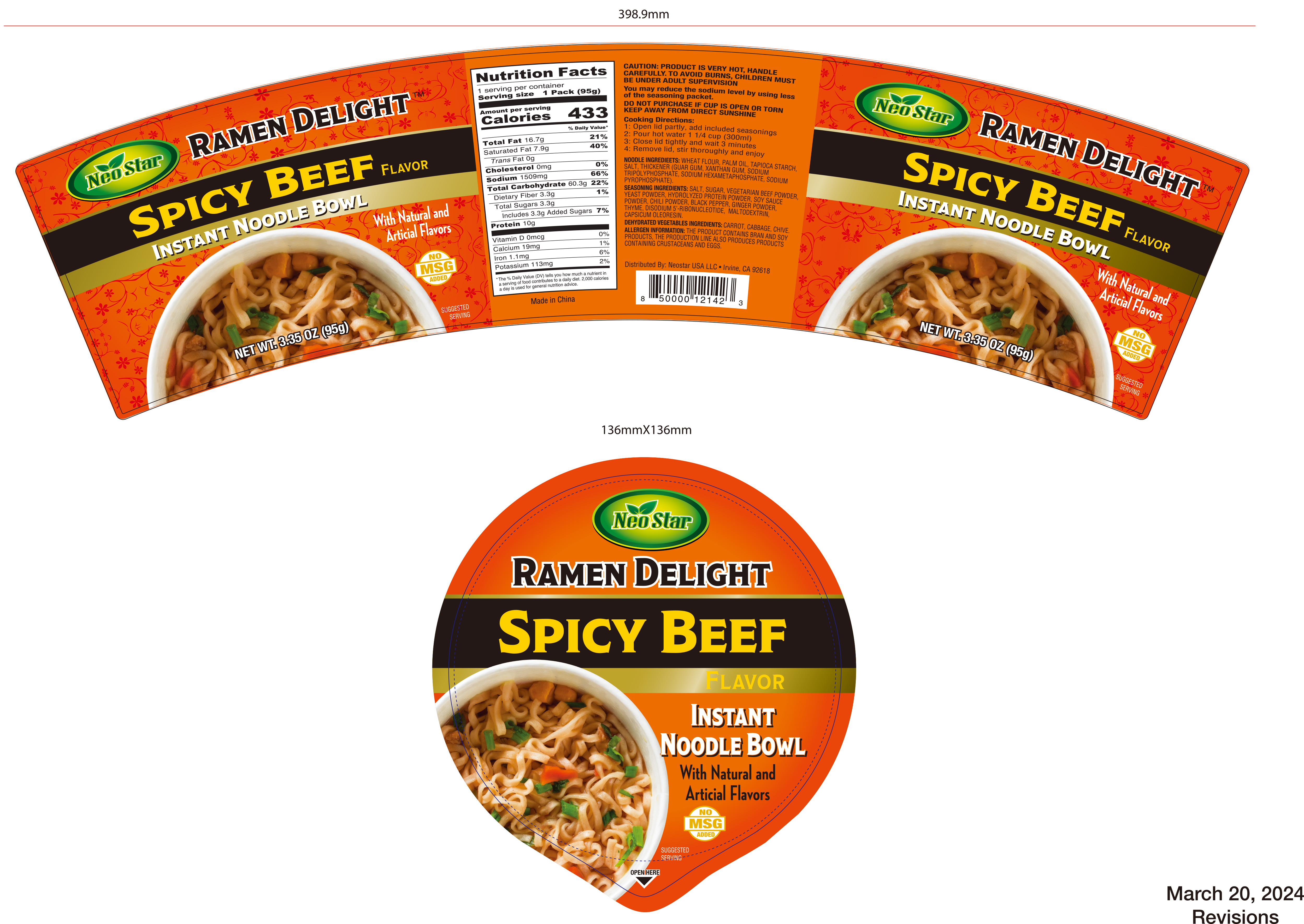 - Ingredients: NOODLE INGREDINETS: WHEAT FLOUR, PALM OIL, TAPIOCA STARCH, SALT,THICKENER(GUAR GUM,XANTHAN GUM,SODIUM TRIPOLYPHOSPHATE,SODIUM HEXAMETAPHOSPHATE,SODIUM PYROPHOSPHATE.) SEASONING INGREDIENTS: SALT, SUGAR, VEGETARIN BEEF POWDER,YEAST POWDER,HYDROLYZED PROTEIN POWDER, SOY SAUCE POWDER,CHILI POWDER,BLACK PEPPER,GINGER POWDER,THYME, DISODIUM 5’-RIBONUCLEOTIDE,MALTODEXTRIN, CAPSICUM OLEORESIN. DEHYDRATED VEGETABLES INGREDIENTS: CARROT, CABBAGE, CHIVE.