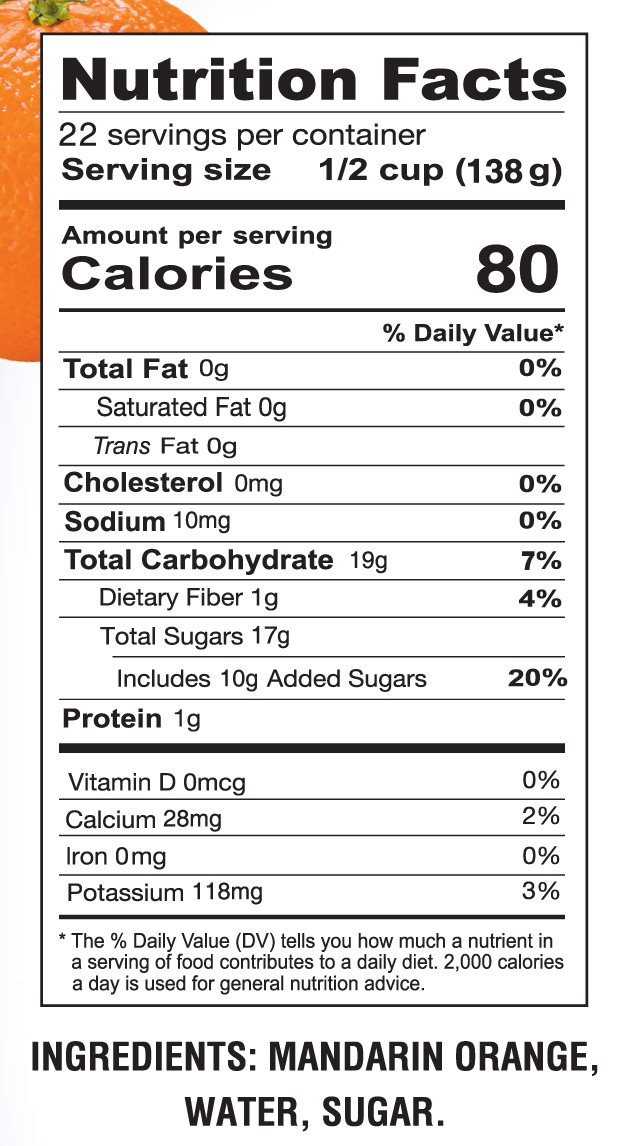 - Ingredients: MANDARIN ORANGE, WATER, SUGAR, CITRIC ACID.