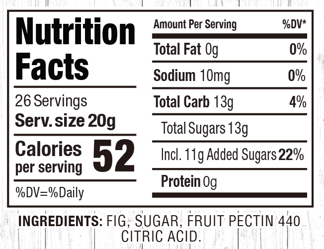 - Ingredients: FIG, SUGAR, FRUIT PECTIN 440, CITRIC ACID.