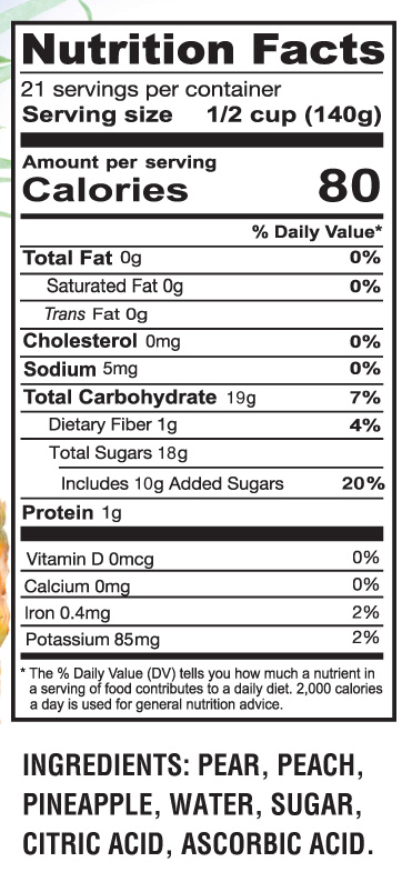- Ingredients: PEACH, PEAR, PINEAPPLE/GRAPE, WATER, SUGAR,CITRIC ACID,ASCORBIC ACID.