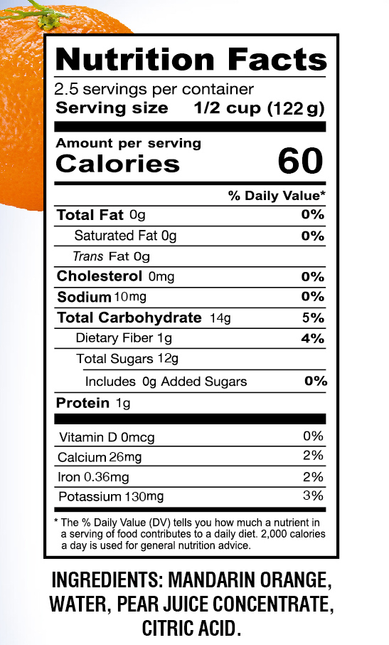 - Ingredients: MANDARIN ORANGE, WATER, PEAR JUICE CONCENTRATE,CITRIC ACID.