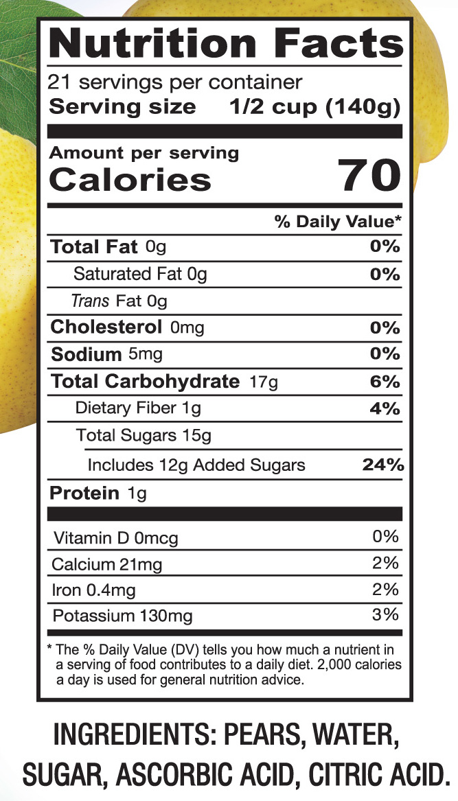 - Ingredients: PEAR, WATER, SUGAR, ASCORBIC ACID, CITRIC ACID.