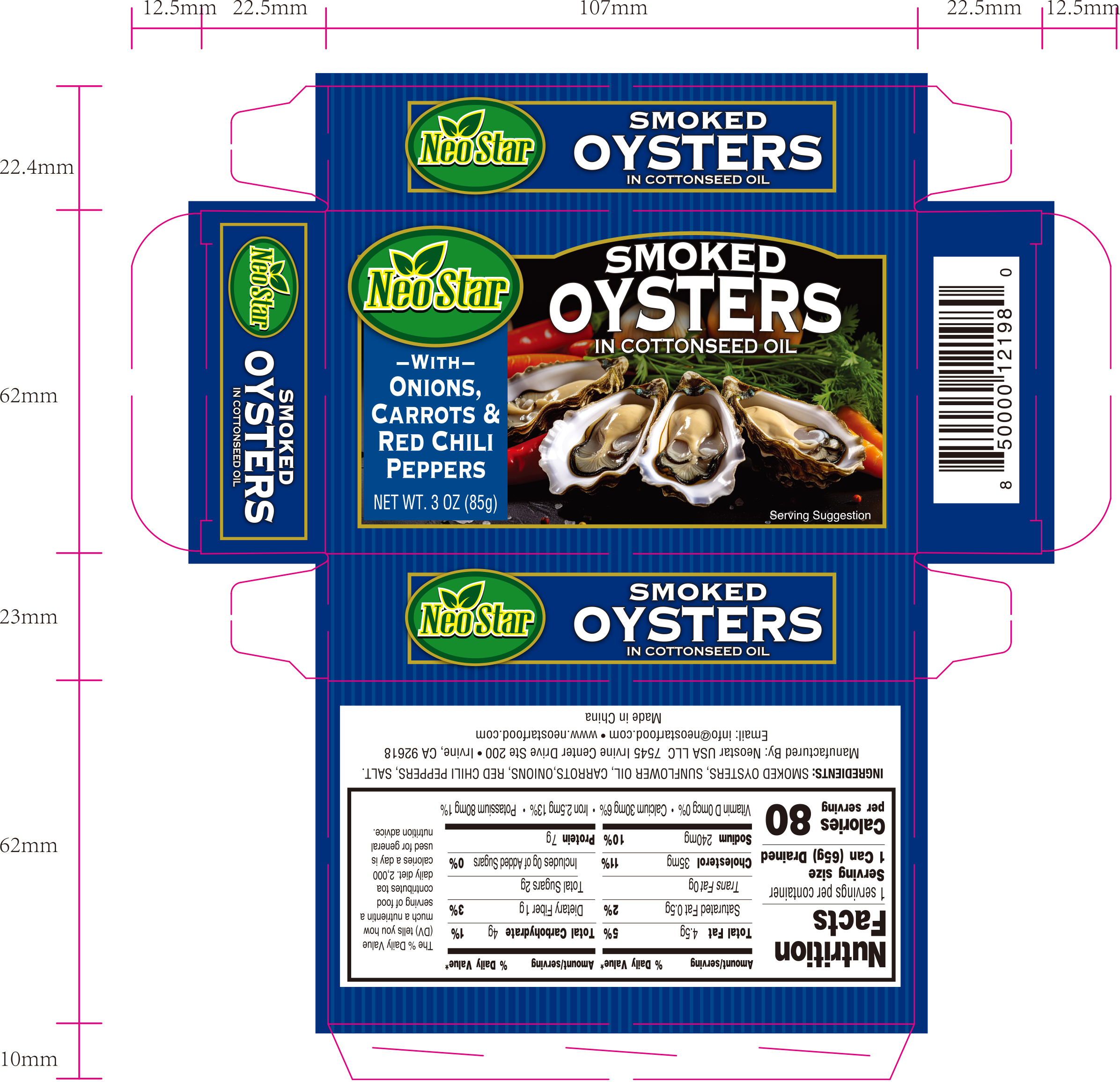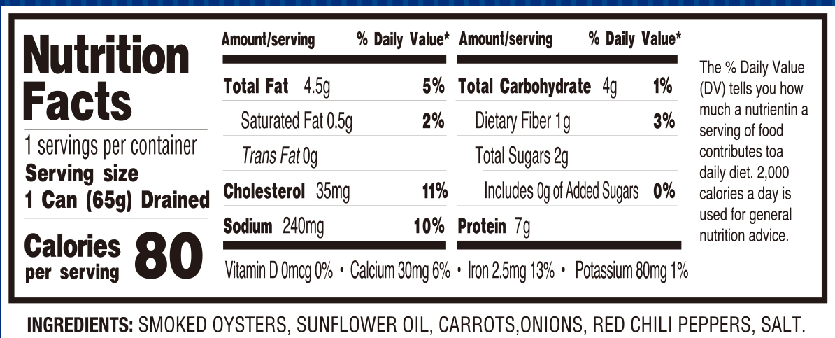 - Ingredients: SMOKED OYSTERS, SUNFLOWER OIL, CARROTS, ONIONS, RED CHILI PEPPERS, SALT.