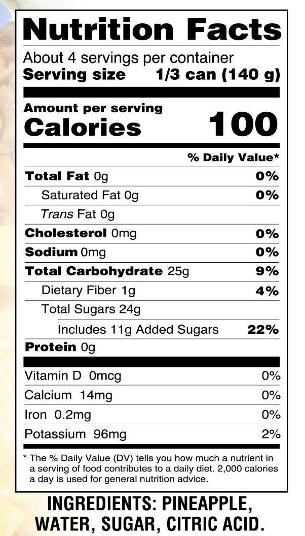 - Ingredients: PINEAPPLE, WATER, SUGAR, CITRIC ACID.