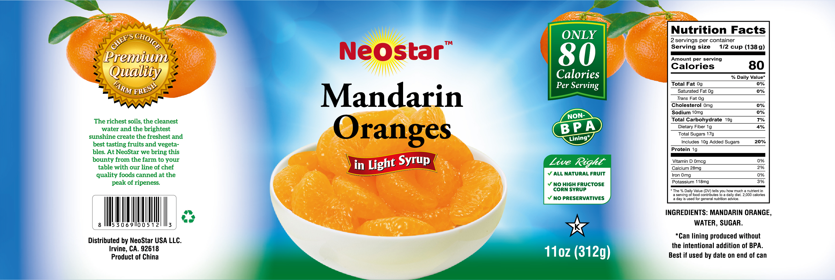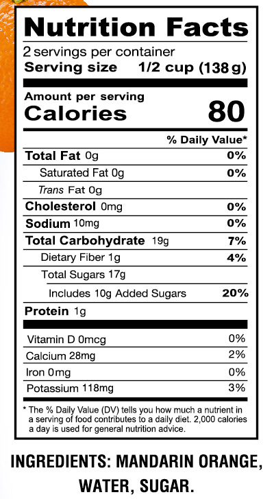 - Ingredients: MANDARIN ORANGE, WATER, SUGAR.