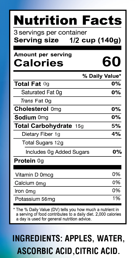 - Ingredients: APPLE, WATER, ASCORBIC ACID, CITRIC ACID.
