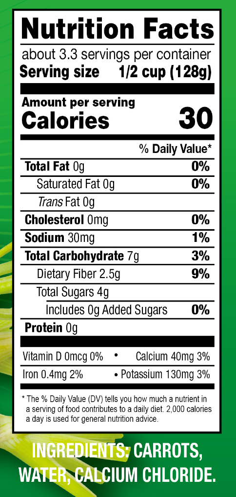 - Ingredients: CARROTS, WATER, CALCIUM CHLORIDE.