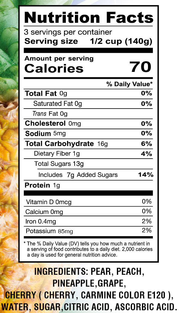 - Ingredients: PEAR, PEACH, PINEAPPLE, GRAPE, CHERRY (CHERRY, CARMINE COLOR E120 ), WATER, SUGAR, CITRIC ACID, ASCORBIC ACID.