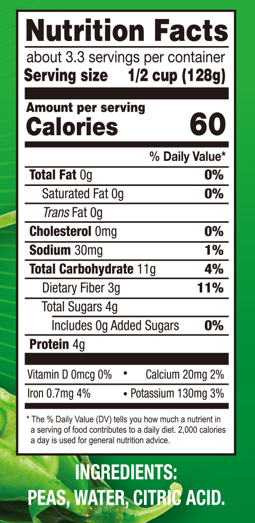 - Ingredients: PEAS, WATER, CITRIC ACID.