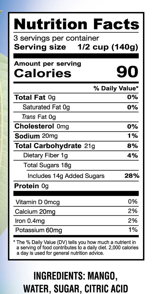 - Ingredients: MANGO, WATER, SUGAR, CITRIC ACID.