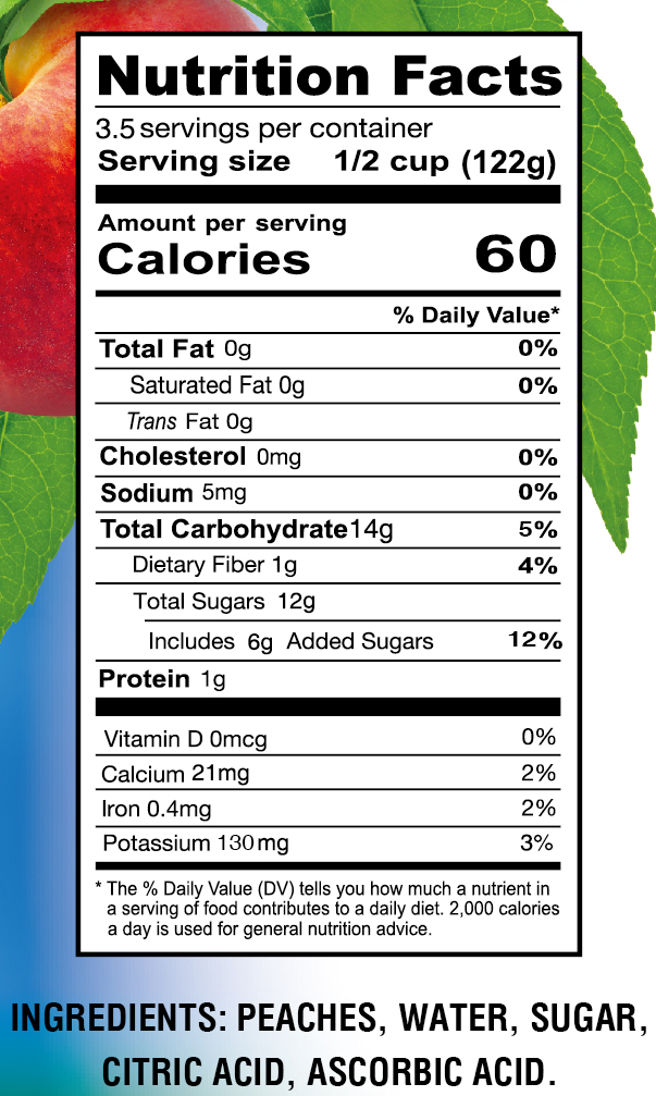 - Ingredients: PEACH, WATER, SUGAR, CITRIC ACID, ASCORBIC ACID.