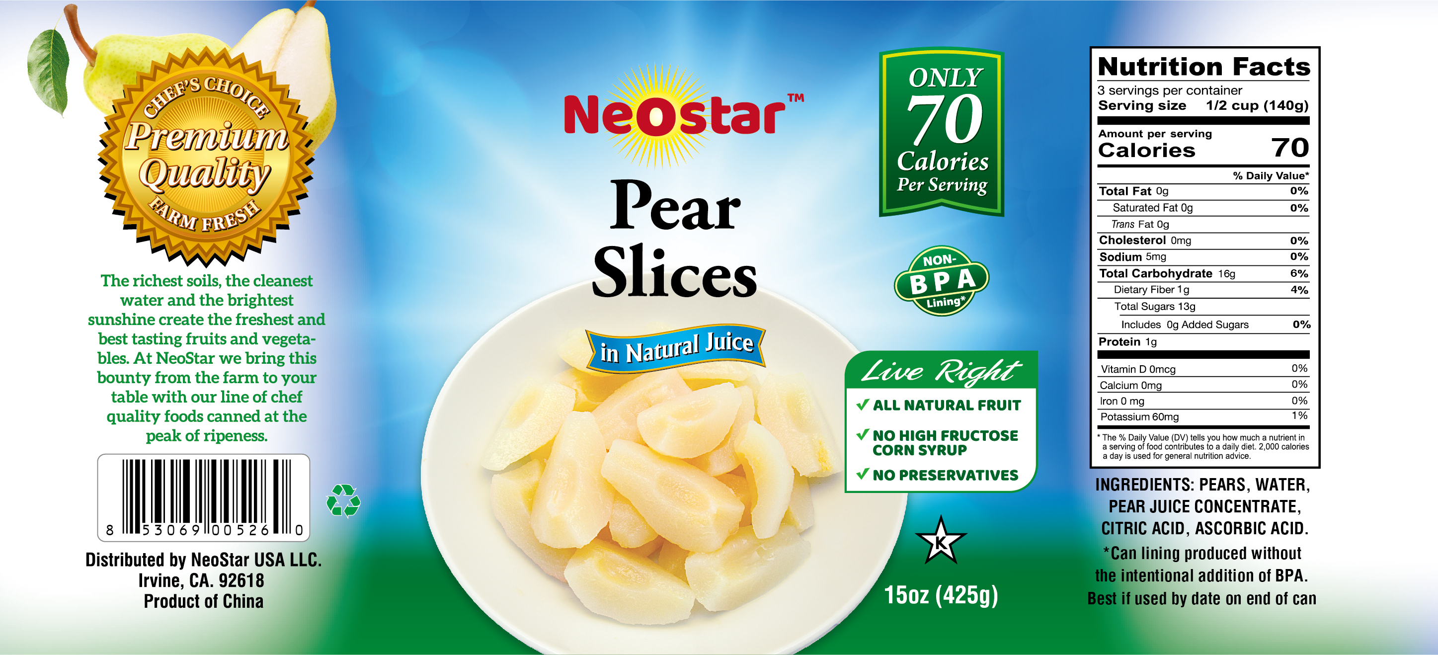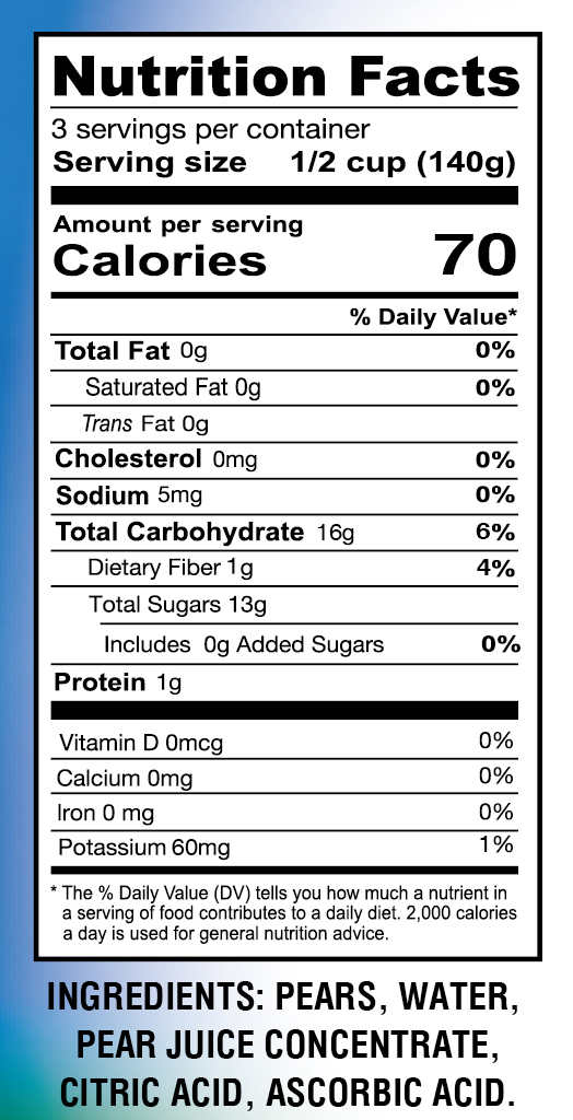 - Ingredients: PEAR, WATER, PEAR JUICE CONCENTRATE, CITRIC ACID, ASCORBIC ACID.
