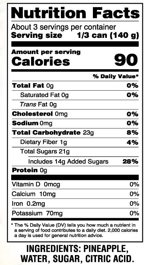 - Ingredients: PINEAPPLE, WATER, SUGAR, CITRIC ACID.