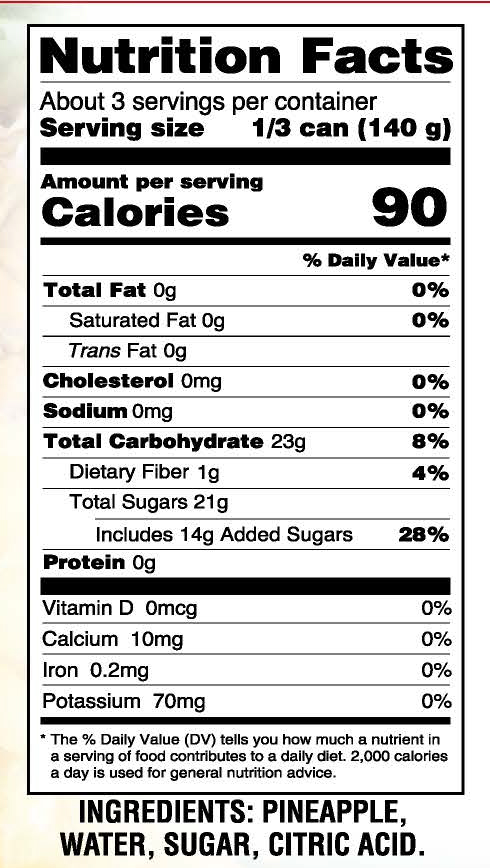 - Ingredients: PINEAPPLE, SUGAR, WATER, CITRIC ACID.